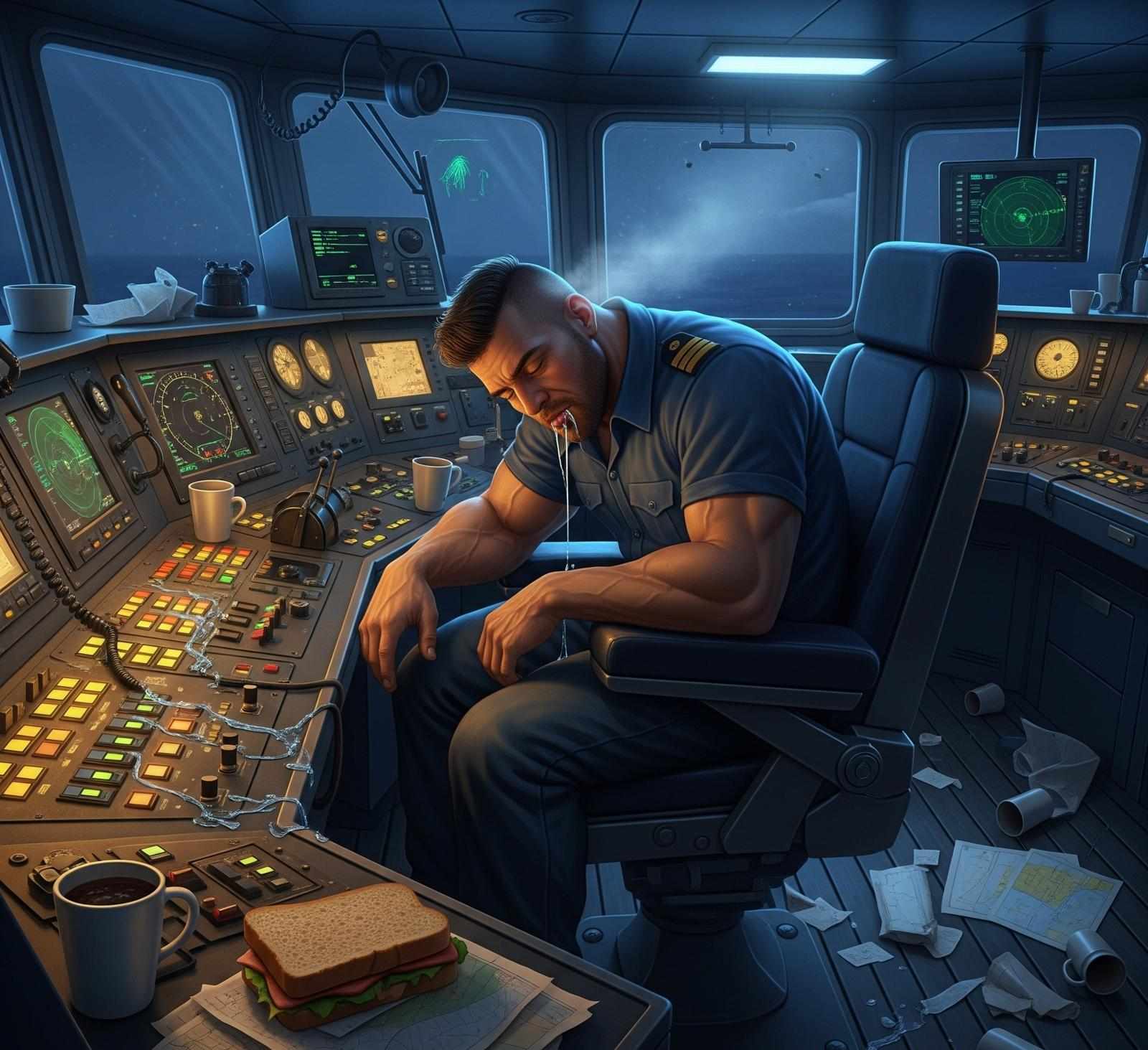 Our ship departed for a new port, and I couldn’t sleep. Since almost everyone was new, I went on the bridge to visit the 2nd Mate. The time was around 2 AM. When I entered the bridge, the 2nd Mate was seated in the navigation chair with his head leaned on the controls. I came closer and saw saliva from his mouth all over the switchboard. It looked like quite a feat for saliva to explore the new land of switches. Suddenly, I was surprised by the Cook and helmsman, who held each other and a bottle of wine.