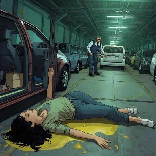 She moved her hand as if to reach for me, then suddenly vomited. Fortunately, she managed to control it somewhat, quickly lowering her head, opening the driver's door, and tumbling out of the car. The mess was mostly confined to the seat, car floor, and outside. I was taken aback, seeing such beauty in her worst state. I closed the passenger door and rushed to help her. She lay in a pool of her own vomit.