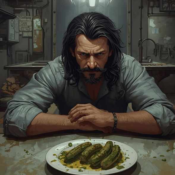Bosun Lemmy was furious and ground his jaw. “That motherfucker!” he stood up and raised his voice. “Stop. Don’t eat it. The meat is spoiled from the rotten sausages, you could get food poisoning.”
