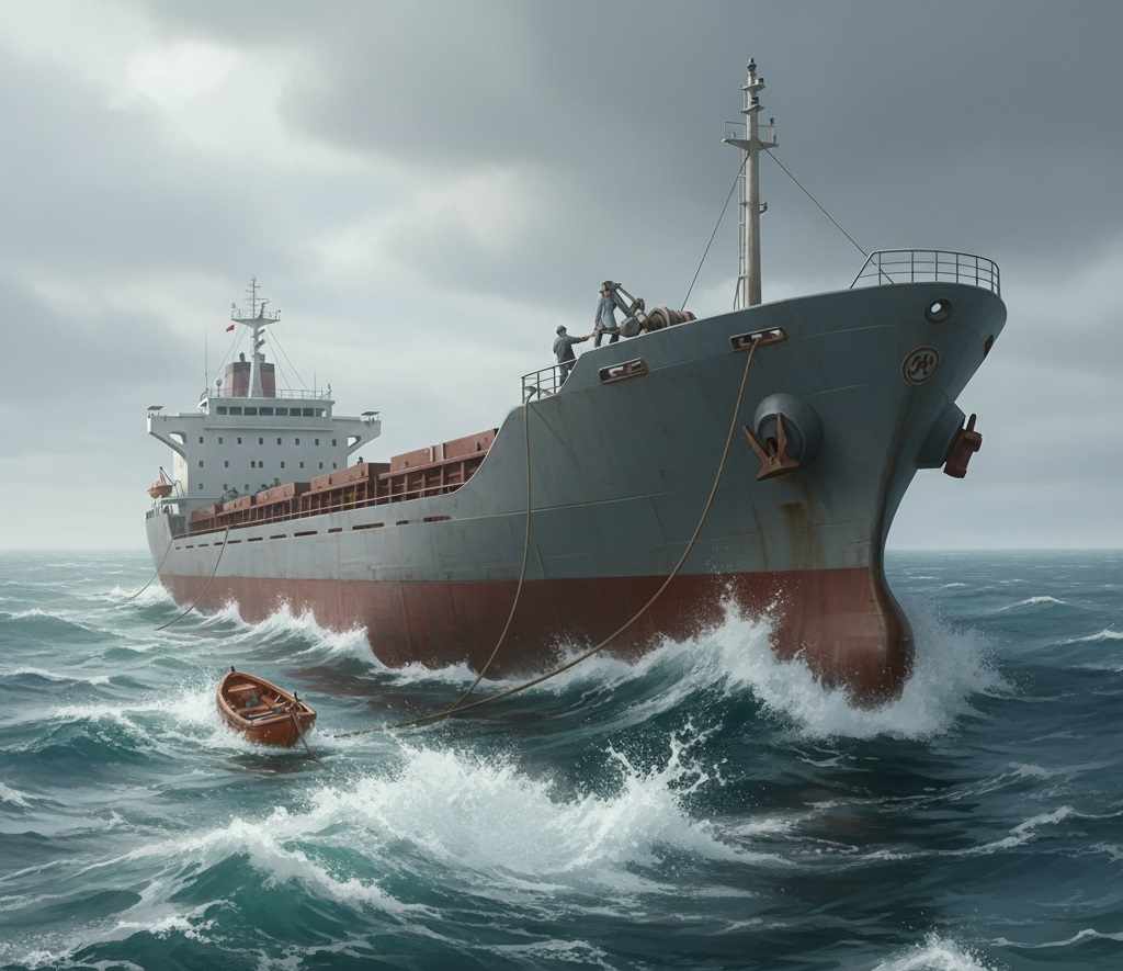 Chief Officer John quietly stood frozen, holding the lowering handle. Bosun Lemmy walked over moved him aside. Bosun Lemmy looked at the boat overboard and saw the front lifeboat rope hanging down, which was used to pull the lifeboat to the deck for boarding. Using a staff with a hook head, he caught the rope, tied it to the crane, and then lowered the rear end of the boat with the lowering handle until it was horizontal again.