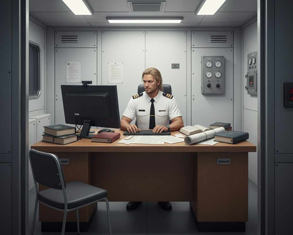 The Captain was seated behind his desk. He was around 40 years old with long blonde hair and a shaved beard. He looked a little bit like the actor Josh Holloway from the TV show Lost. His presence was notable from afar. At first glance, you would say he was a cool guy.